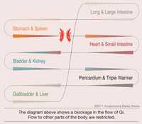 An obstruction to the flow of Qi is like a dam. When Qi becomes backed up in one part of the body, the flow becomes restricted in other parts. This blockage of the flow of Qi can be detrimental to a person’s health, cutting off vital nourishment to the body, organs and glands.