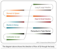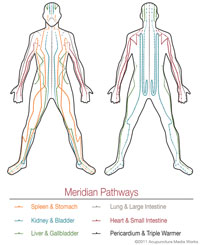 Qi flows through specific pathways called meridians. There are fourteen main meridians inside the body. The diagram to the left shows the meridian pathways in the body. Each of these is connected to specific organs and glands.